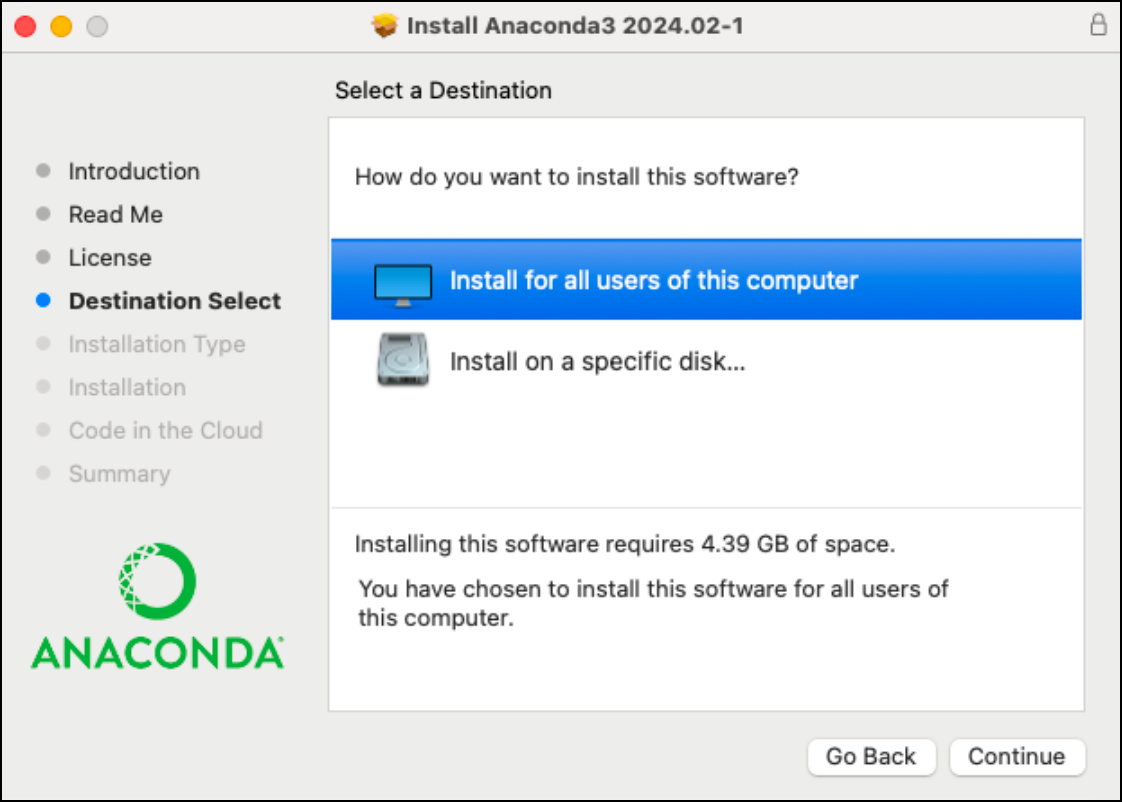 - Open the downloaded .pkg file and follow the installation instructions. You can install Anaconda for all users.