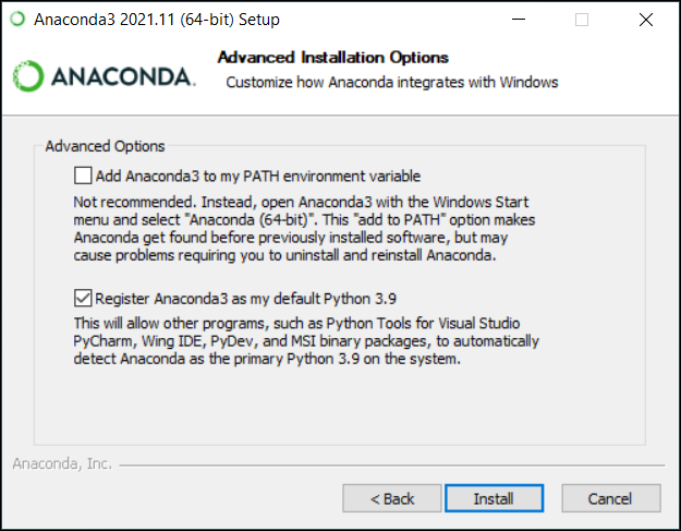 - In the “Advanced Options” section, check “Add Anaconda to my PATH environment variable” and “Register Anaconda as my default Python”.