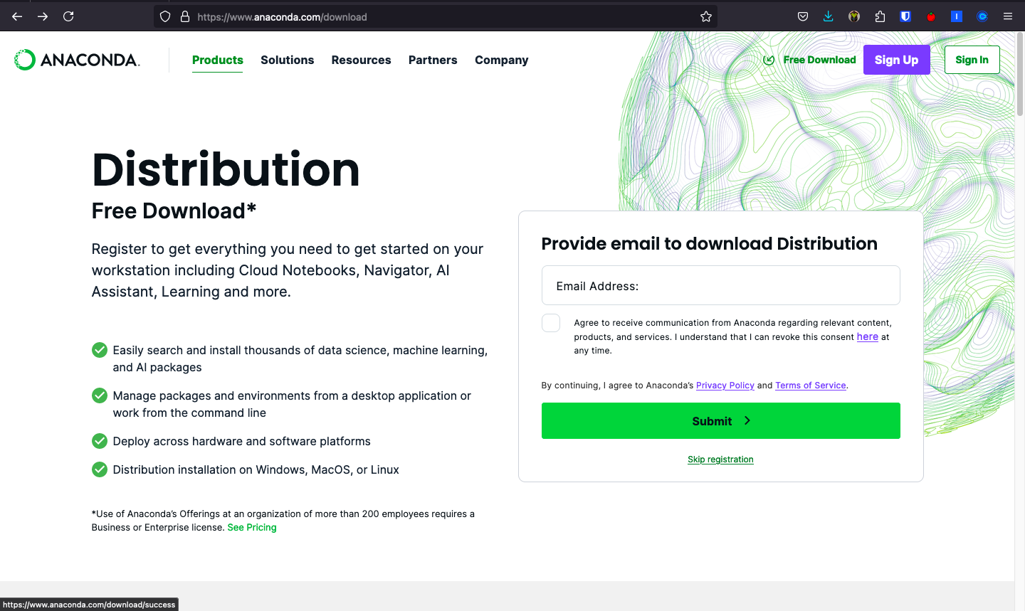 - Visit the Anaconda website: https://www.anaconda.com/products/distribution. You can skip the registration if you prefer.