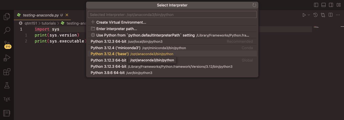 - Choose the Anaconda Python interpreter from the list. It should be labelled something like “Python 3.x.x (‘base’) Conda”.