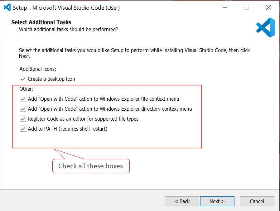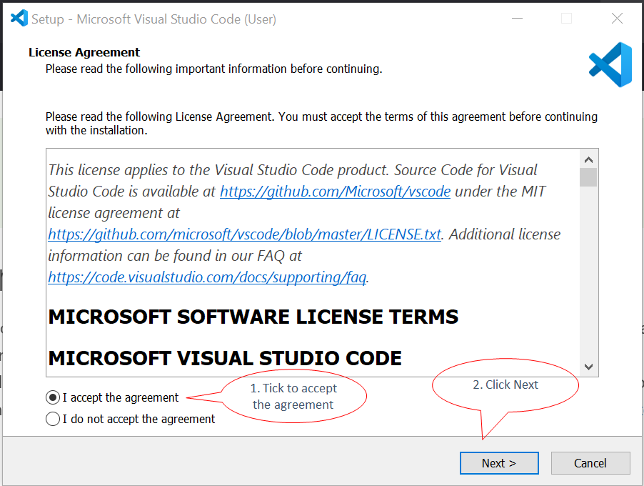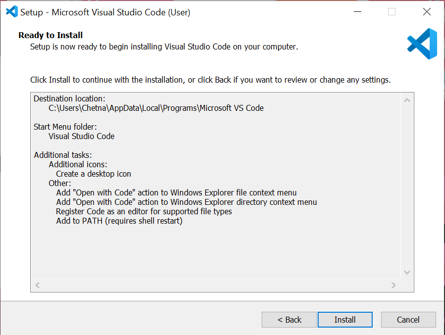 - Run the “VSCodeUserSetup-{version}.exe” file.