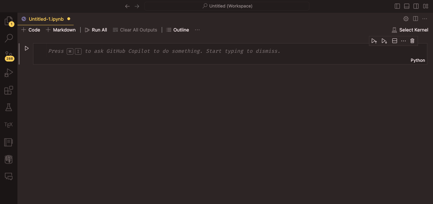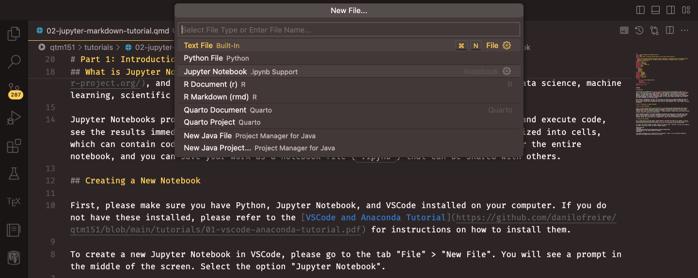 To create a new Jupyter Notebook in VSCode, please go to the tab “File” > “New File”. You will see a prompt in the middle of the screen. Select the option “Jupyter Notebook”.