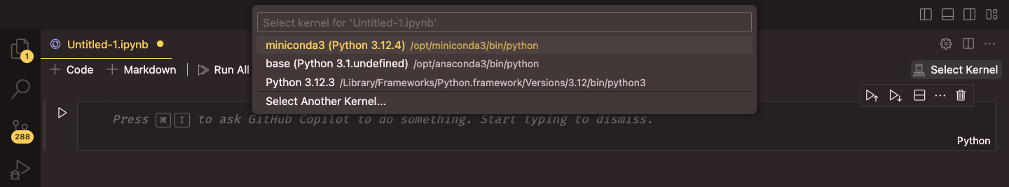 Please do not forget to select the Python interpreter that you want to use for the notebook. You can do this by clicking on the Python version at the top right corner of the screen. A prompt will appear, and you can select the Python interpreter that you want to use (in this case, Anacoda’s “base”).