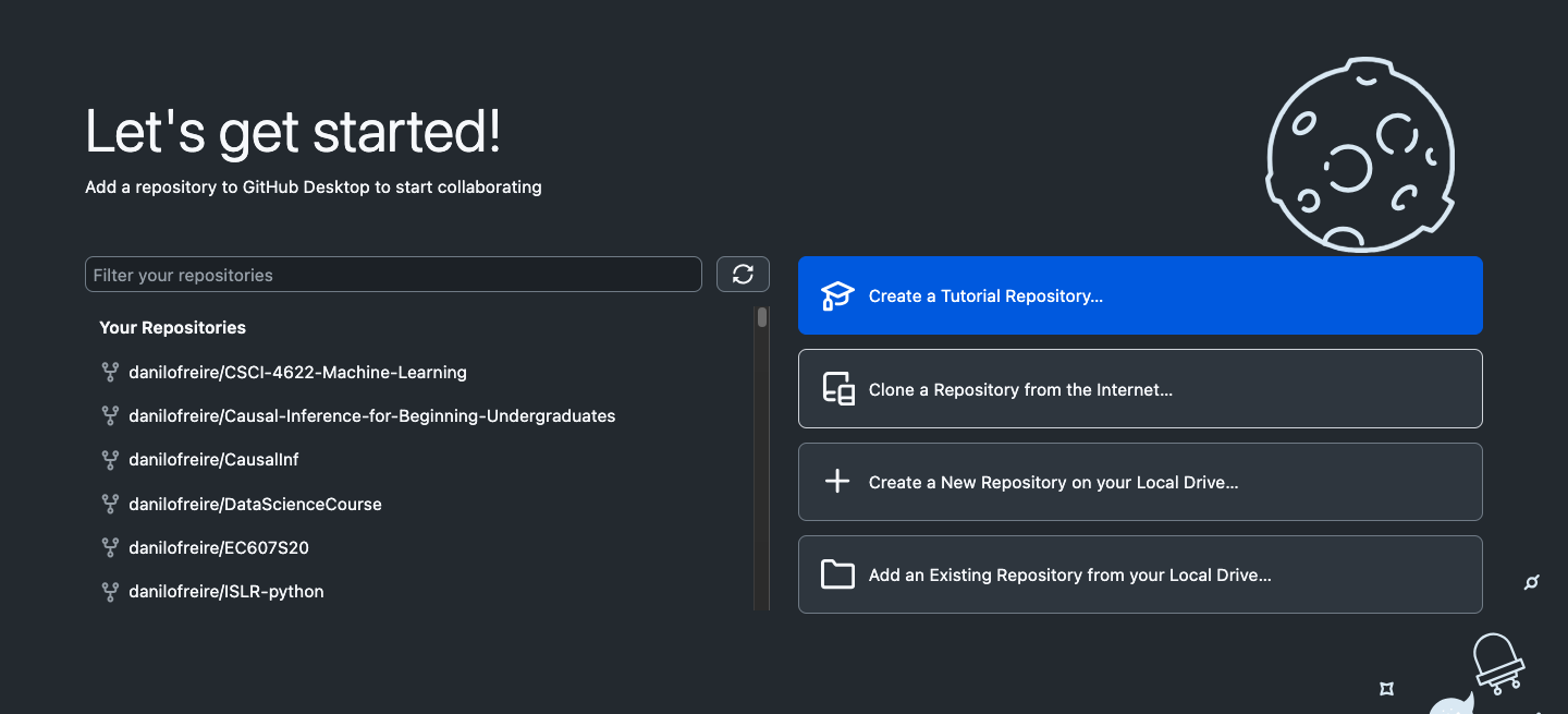 - Download and install GitHub Desktop. You can download GitHub Desktop from https://desktop.github.com/. GitHub Desktop is a graphical user interface (GUI) for Git that makes it easier to work with repositories. It is available for Windows and macOS. You can also use the command line if you prefer, but GitHub Desktop is more user-friendly and will be used in this tutorial.