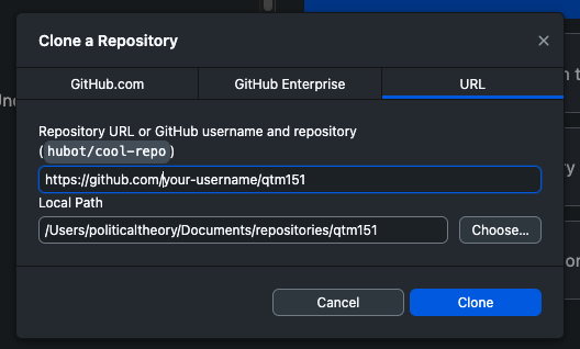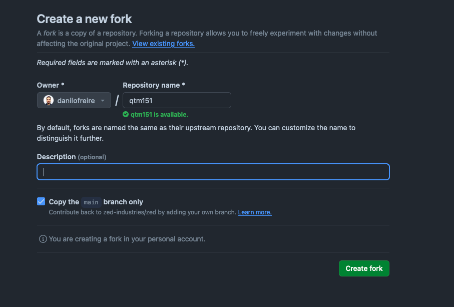 You will be asked to make your own copy of the lecture notes. You can add any name you like. I recommend you use the name same name I used for the repository (qtm151). This will make it easier to follow the instructions in the tutorials. Click on “Create fork”.