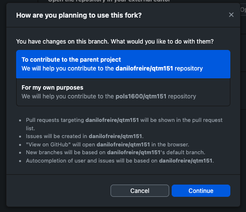 Then select “To contribute to the parent project” and click on “Continue”. This option allows you to keep updating your lecture notes from the instructor’s repository. The other option creates a local copy that has no links to the original repository. If you accidentally choose this option, you will not be able to see any changes. To reverse: (a) remove the repository on your computer (by right-clicking on the repository on Github dekstop), (b) manually delete the directory, (c) go back to Step 2.