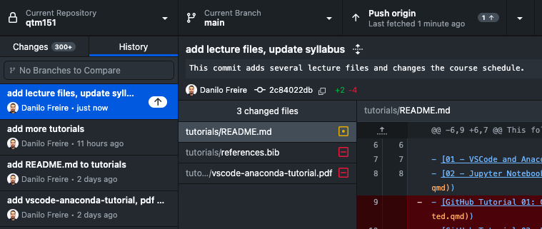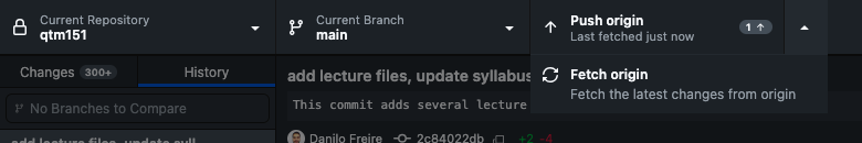 As you can also see, there are two options: “Push” and “Fetch”. “Push” will push your changes to GitHub, while “Fetch” will fetch (“download”) changes from GitHub. You can use “Fetch” to update your local repository with the changes from GitHub. We will cover this in more detail in the next section.
