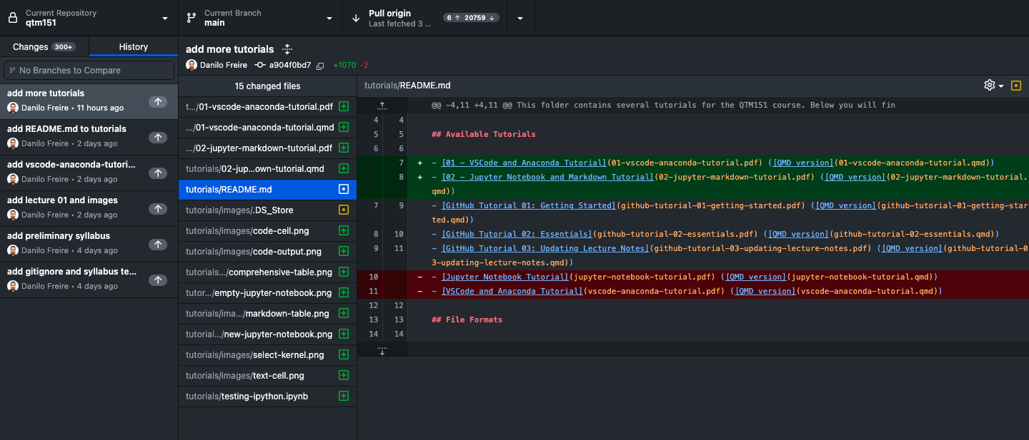 The course materials will be updated regularly with new content, bug fixes, and improvements. To keep your copy of the course materials up to date, you need to pull changes from the original repository. However, before proceeding, make sure that you have read the previous section and that you have committed all outstanding changes.