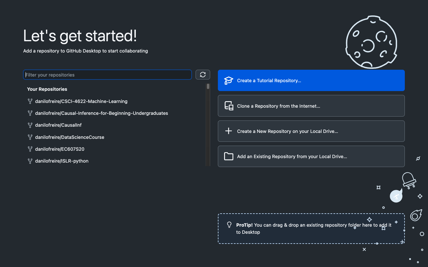 After you install GitHub Desktop, you will need to sign in with your GitHub account. This will allow you to work with your repositories. Then you should see the following screen: