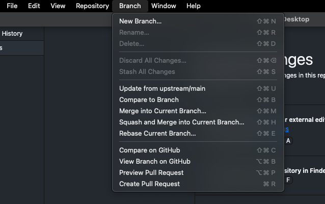 - In the top panel go to the “Branch” tab. Click on the option “update from upstream/main”.