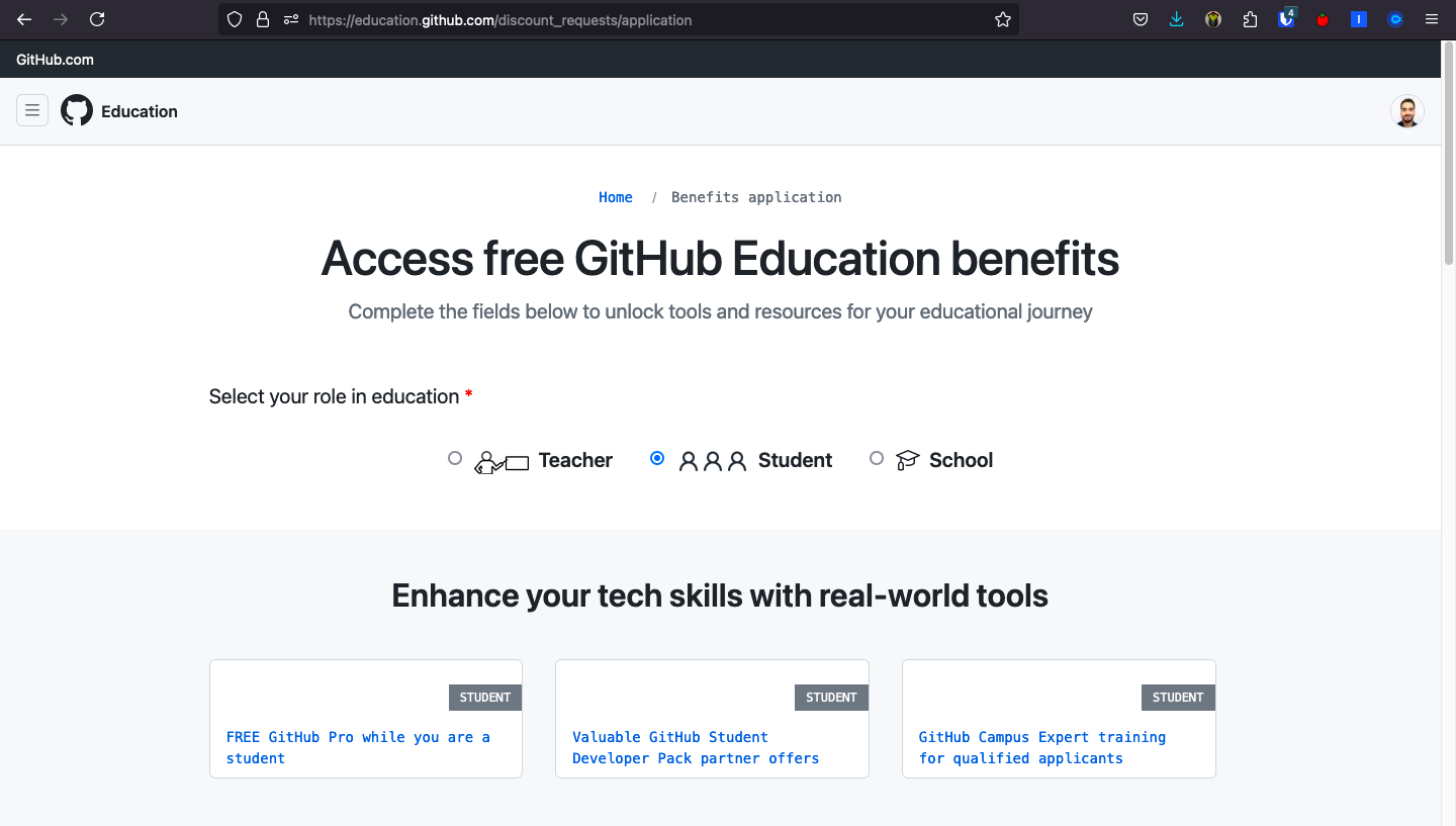- Apply to GitHub Education. Go to https://github.com/education and apply for the GitHub Student Developer Pack. This will give you access to several tools and services for free, such as a free domain name, cloud hosting, and more. You will need to provide proof of your student status, such as an ID card or transcript. Please click on “Join GitHub Education” and follow the instructions on the website.