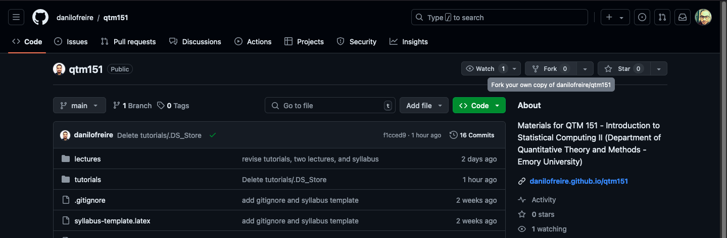 The course materials are available on GitHub at https://github.com/danilofreire/qtm151. You should “fork” the repository to your account. This will create a copy of the repository in your account that you can modify and push changes to. Please click on the top-right corner of the repository page and select “Fork”.