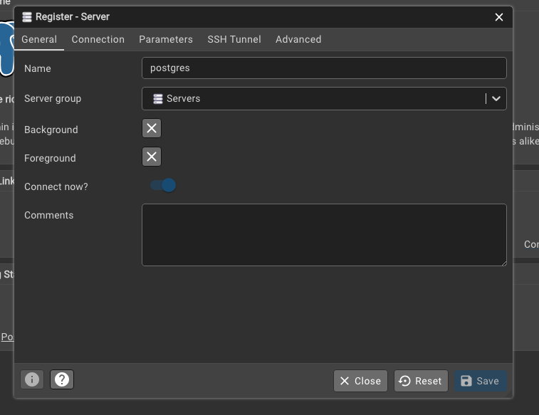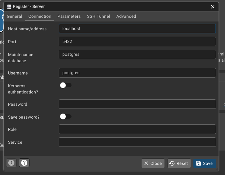 # In our case, the username is postgres, password is blank, host is localhost,