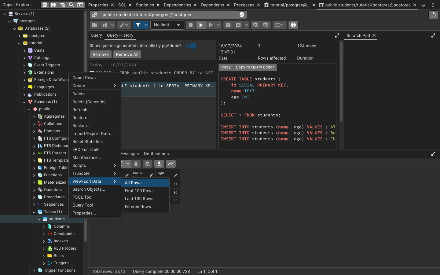 You can also find the table students under the tutorial database on the left-hand side of the pgAdmin window. Click on tutorial, then on Schemas, public, and finally on Tables to see the students table. You can right-click on the table and select “View/Edit Data” to see the rows you inserted. You will also see the query you just ran in the “History” tab.