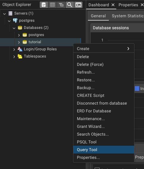 If you have made it this far, congratulations! You have successfully set up a PostgreSQL database on your computer. Now let us create a table in the tutorial database. Right-click on the tutorial database and select “Query Tool” to open a new query window. You can write SQL queries in this window to interact with the database.