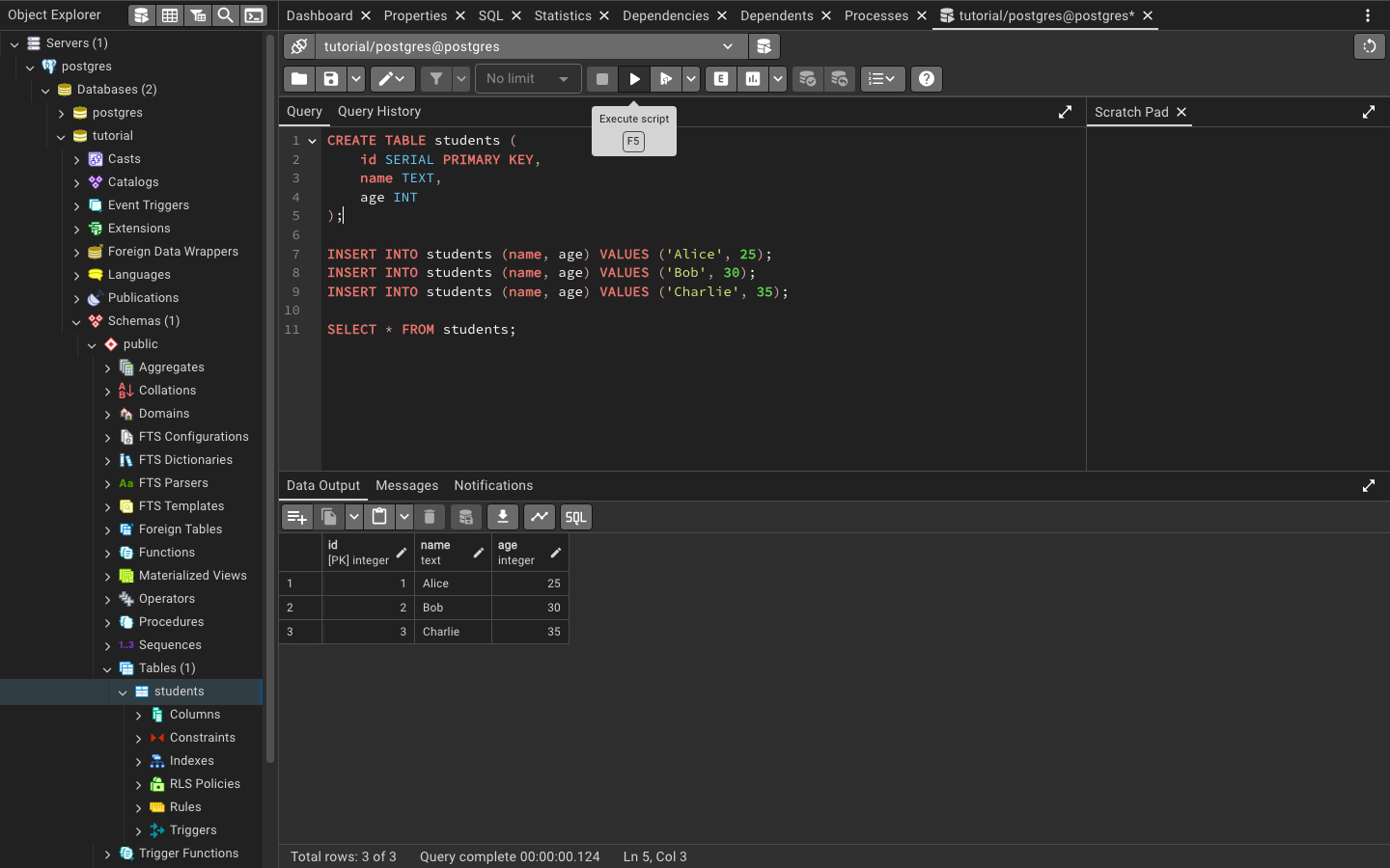 SELECT * FROM students;Click on the “Execute” button to run the query, or press F5 on your keyboard. You will see the results of the query in the lower panel of the query window. The three INSERT statements add three rows to the students table with the names Alice, Bob, and Charlie, and their respective ages. The SELECT statement retrieves all the rows from the students table and shows the three rows you just inserted.