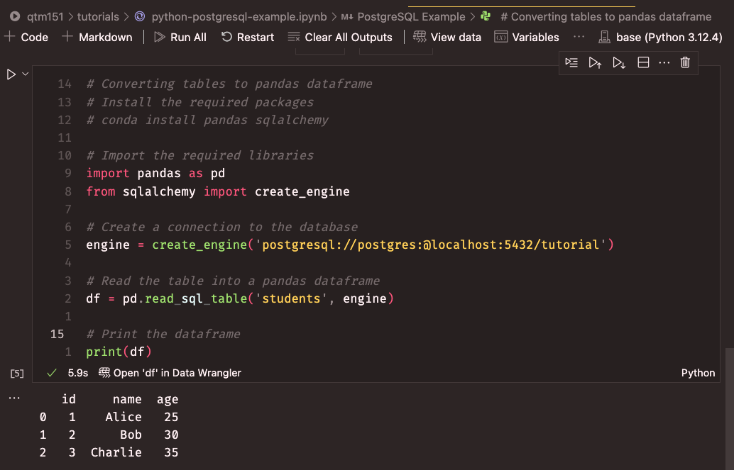 conn.close()This code connects to the tutorial database on localhost using the psycopg2 library. It runs a query to select all rows from the students table and prints the results. You can run this code in a Python script or a Jupyter notebook to interact with the database from Python. You can find a Jupyter Notebook with this code in the GitHub repository.