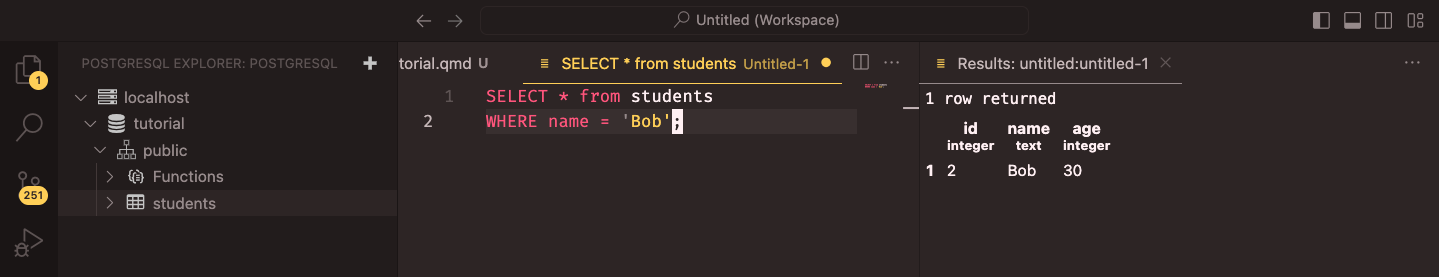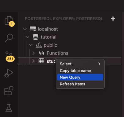 You are ready to run queries in VS Code. Click with the right button on the students table and select “New Query” to open a new query window. You can write the same SQL queries you used in pgAdmin to interact with the students table. As with pgAdmin, you run the queries by pressing F5 on your keyboard. For example: