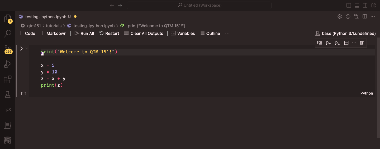 Please do not forget to select the Python interpreter that you want to use for the notebook. You can do this by clicking on the Python version at the top right corner of the screen. A prompt will appear, and you can select the Python interpreter that you want to use (in this case, Anacoda’s “base”).