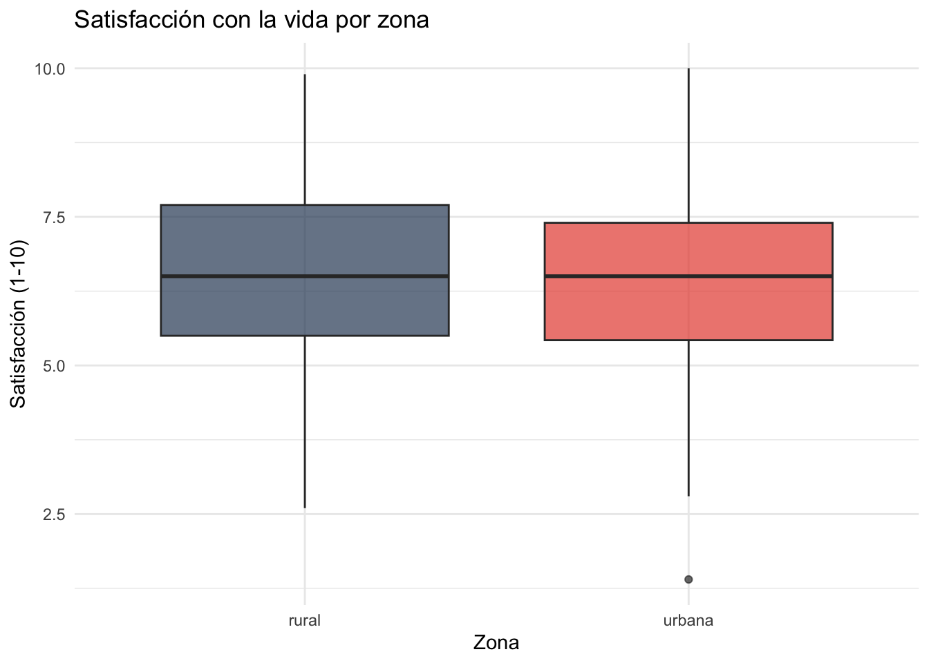 Respuesta: La diferencia entre zonas urbana y rural puede ser pequeña en este dataset simulado. En datos reales de Latinoamérica, la relación entre zona y satisfacción es ambigua: las zonas urbanas suelen tener mayor acceso a servicios, pero también más desigualdad y costos de vida. El boxplot permite ver si hay diferencias en la mediana y la dispersión.